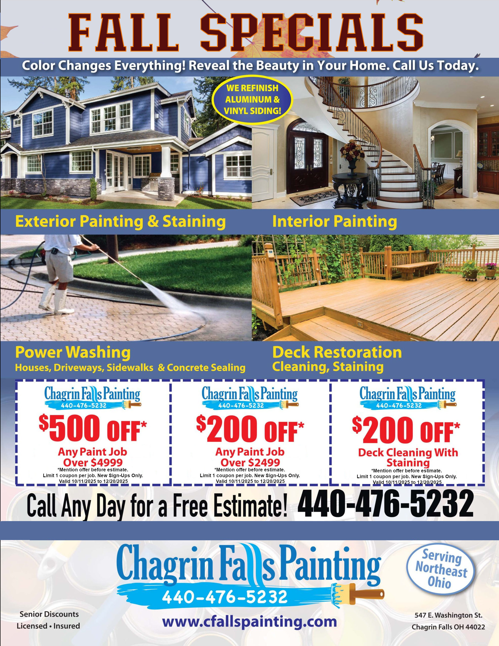 Chagrin Falls Painting provides expert Interior and Exterior painting services. We use only the finest quality products to make your home come to life.